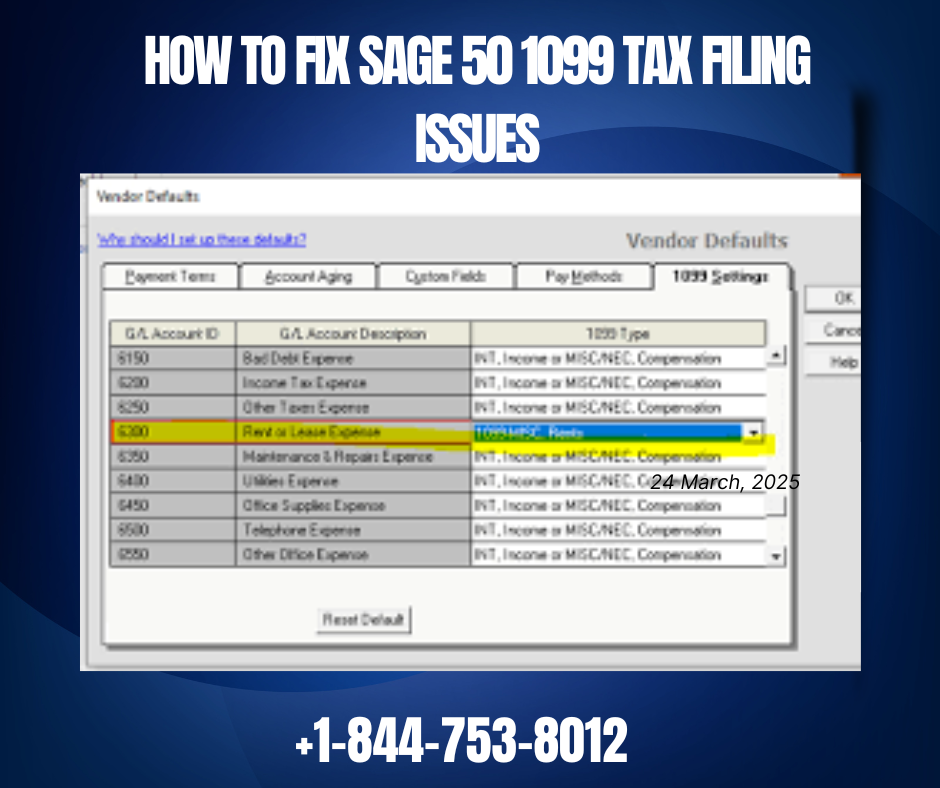 Fixing Sage 50 1099 filing issues requires accurate vendor data and proper software setup. Whether it’s missing names, Box 7 errors, payroll mismatches, or outdated software, these steps will help you file accurately and avoid IRS penalties. For expert guidance and immediate help, call Sage 50 support at 844-753-8012.